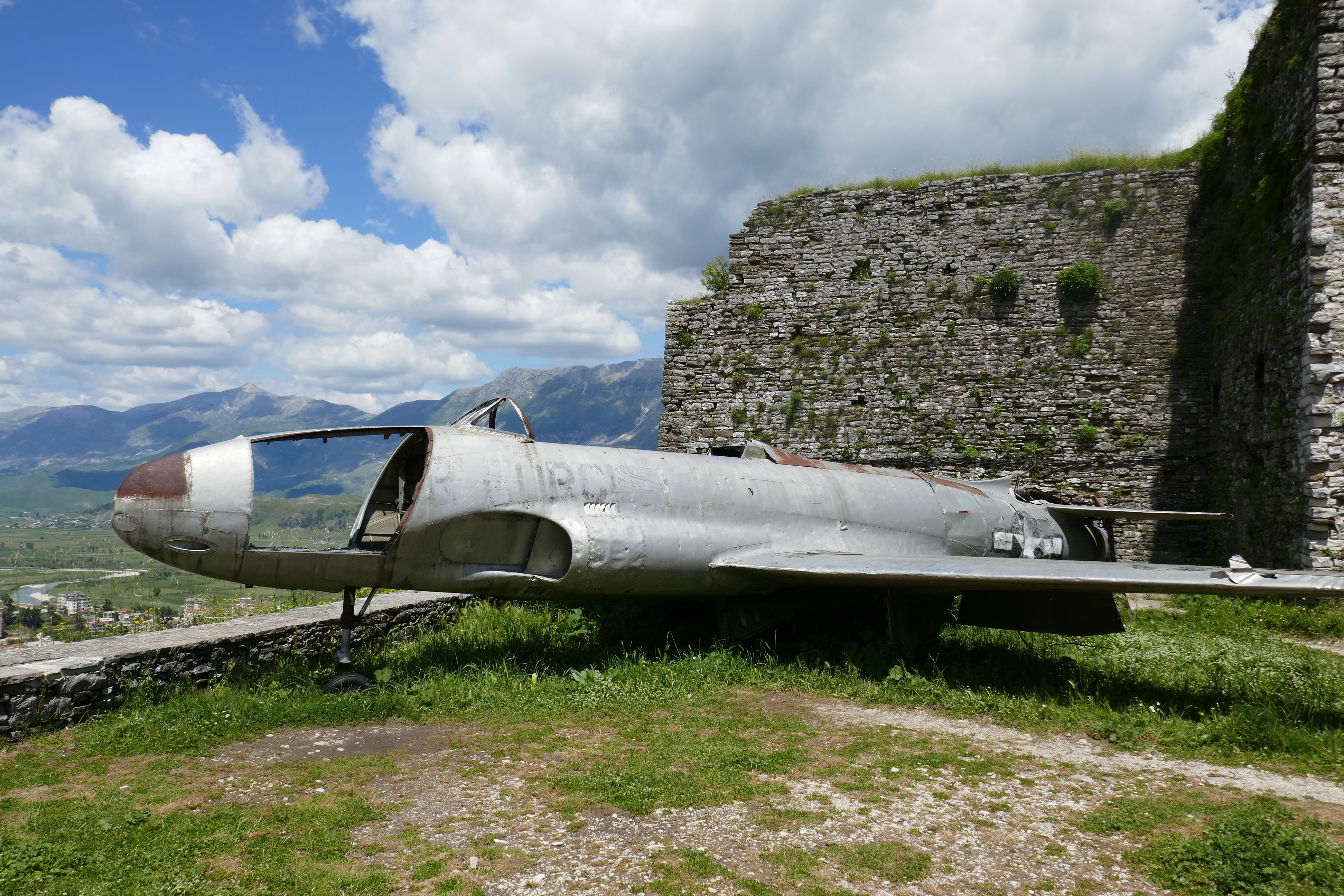berge mountains city made of stone enver hoxha festung fort flugzeug aircraft gjirokastr ismail kadare kalaja e argjirose museum museumsstadt city of museum stadt aus stein unesco weltkulturerbe world heritage vegetation