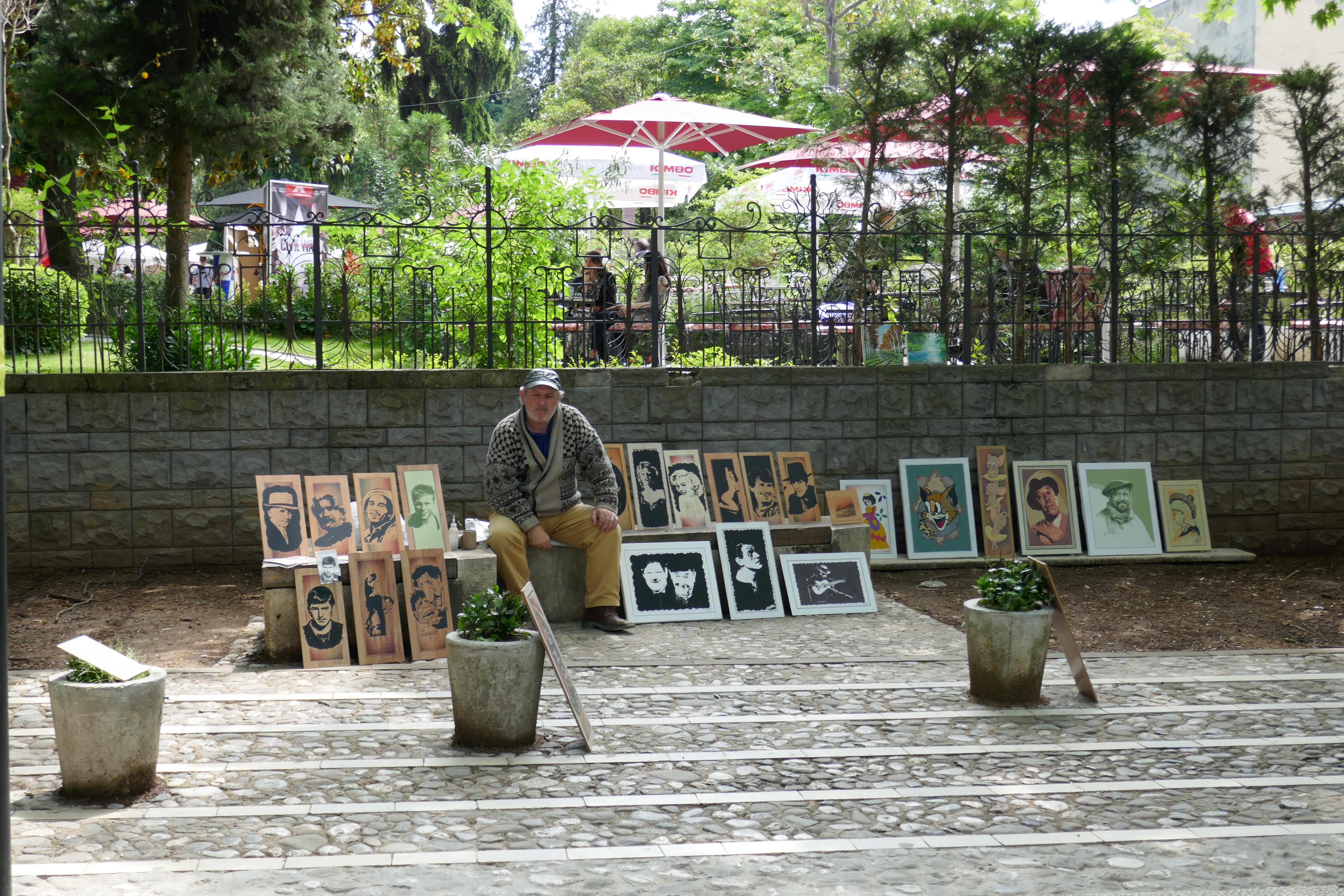 bilder pictures blumenkübel flowerpot künstler artist mauer wall menschen people schirm umbrella tirana