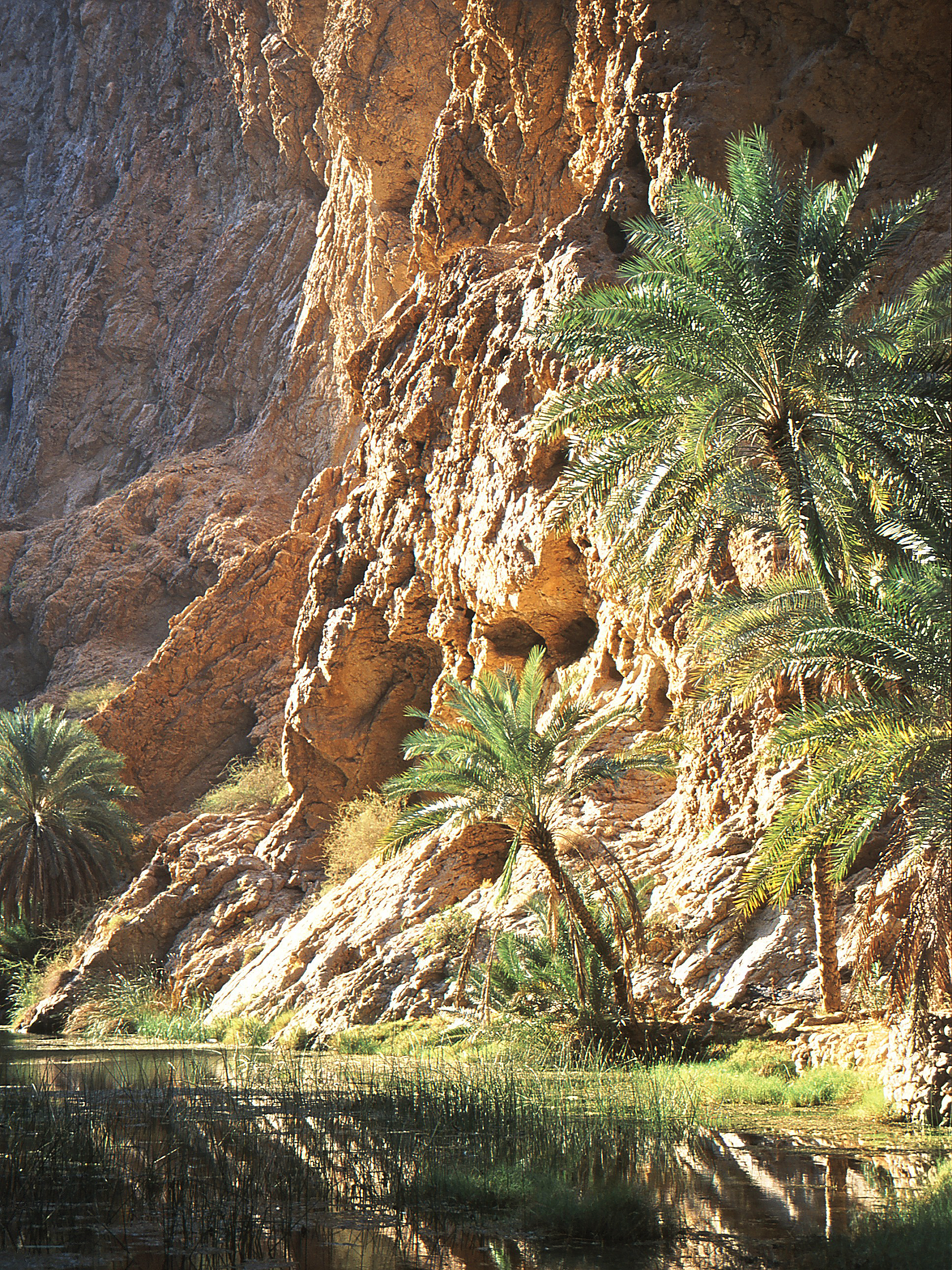 berge mountains felsen rocks flussbett riverbed geologie geology landschaft landscape palmen palms pflanzen plants wadi wasser water