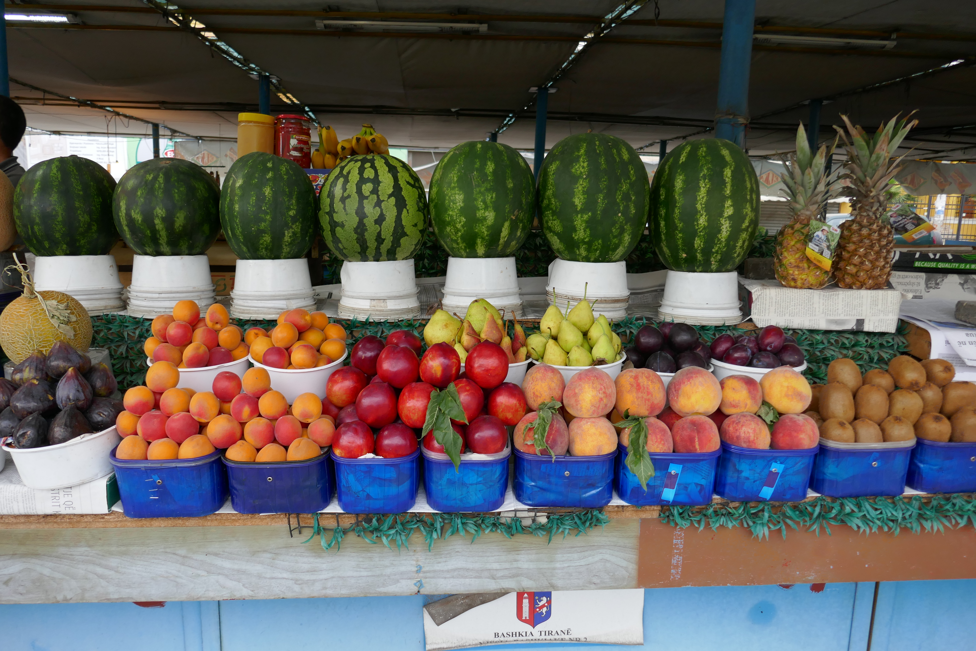 Share Content Published 10/05/2021 Tirana Impressionen / Impressions © Michael Dickinson ananas aprikose apricot kiwi lebensmittel food melone obst fruit pfirsich peach tirana
