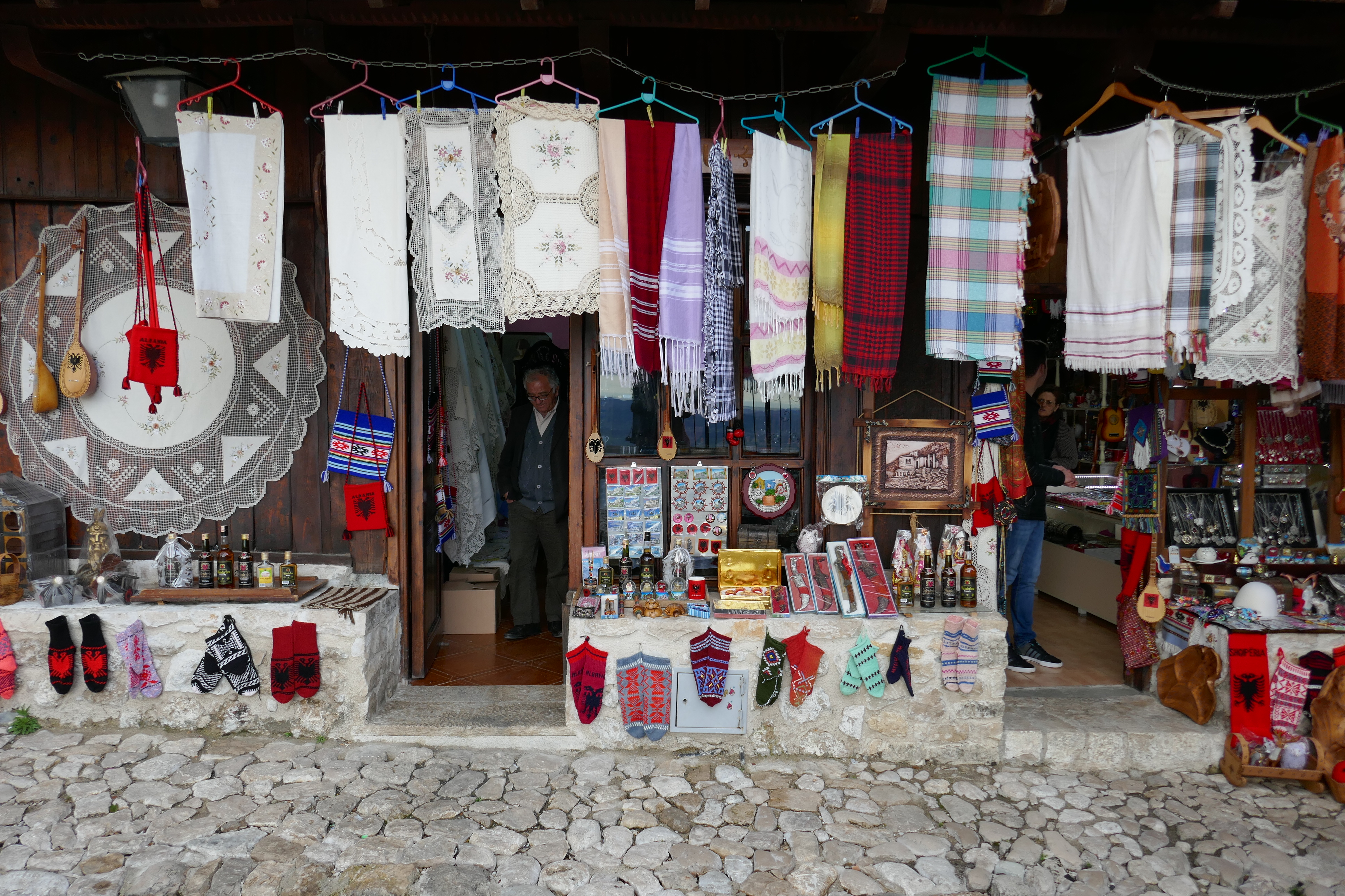 Share Content Published 12/05/2021 Kruja © Michael Dickinson albanian long-necked lute albanische langhalslaute basar bazar kruja qifteli souvenir stricksocken knitted socks tischdecke table cloth tourismus tourism two-headed eagle webtuch woven cloth zweiköpfiger adler